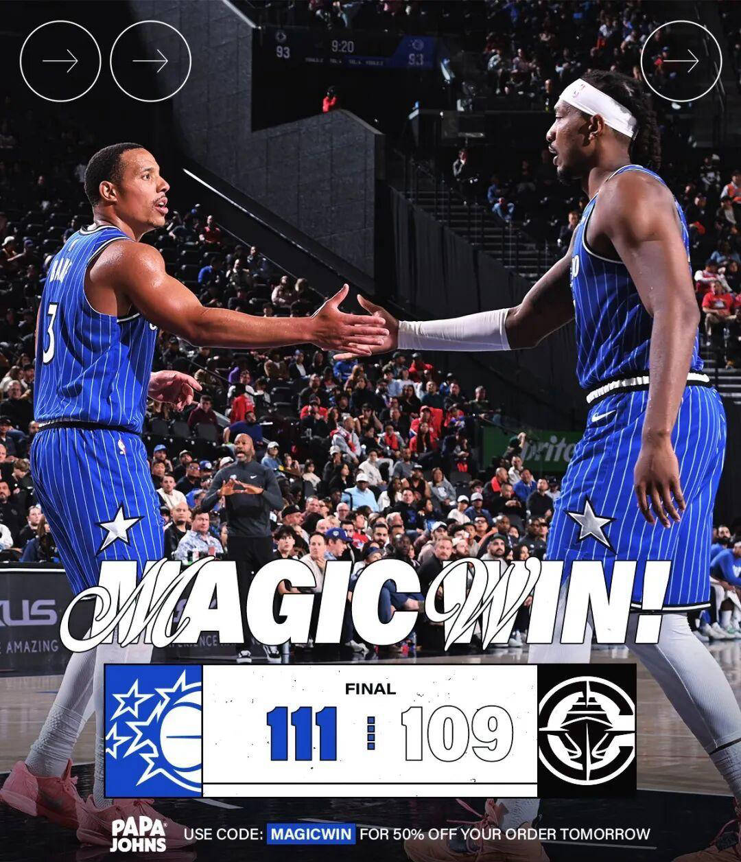 关键的第四节,班凯罗为贝恩制造机会,贝恩逐渐挑起魔术大旗的重担。快船替补尼德豪泽表现积极,在关键时刻封盖贝恩上篮,但经过录像回放裁判判定为干扰球。比赛最后28秒,伦纳德中距离命中追至仅差2分。魔术暂停后在前场边线球环节,尼德豪泽成功扇飞贝恩上篮。快船掌握绝杀良机,但主教练泰伦卢并未请求暂停。终场倒计时2秒,伦纳德被夹击将球传给马瑟林,马瑟林获得绝杀三分机会却遗憾未中。最终魔术以111-109险胜快船。