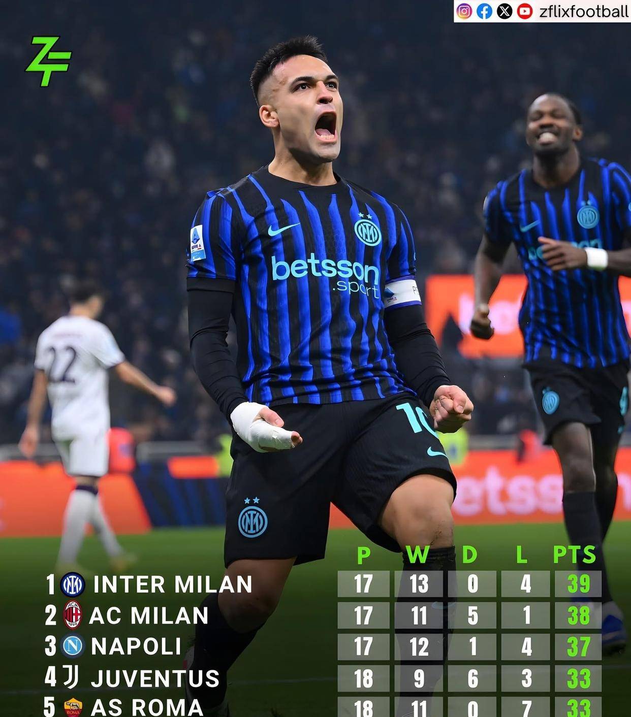 主教练齐沃打造的传控体系,让国米的比赛场面往往占据主动。 锋线上,劳塔罗·马丁内斯是绝对的大腿,他不仅以11个进球领跑射手榜,更成为了现役攻破意甲所有29支球队球门的第一人,风头无两。 第18轮对阵博洛尼亚,正是他的一传一射,为球队打开了胜利之门。 但国米的后防线正遭遇严重的伤病潮,一度有6名后卫同时伤缺,这为他们的下半程埋下了巨大的隐患。