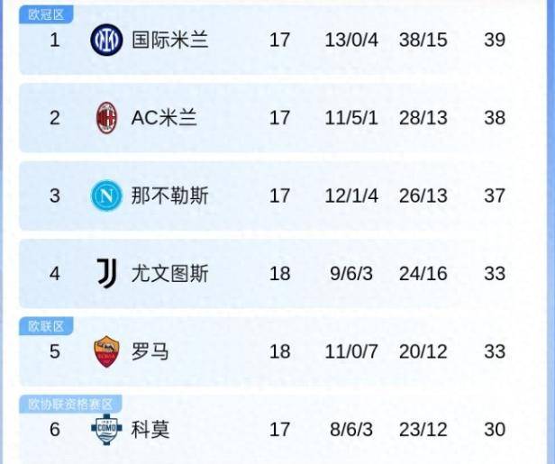 这场胜利让国际米兰在积分榜上实现了登顶。根据意甲最新积分榜,国际米兰17场比赛13胜0平4负,进38球失15球,积39分排名第一。