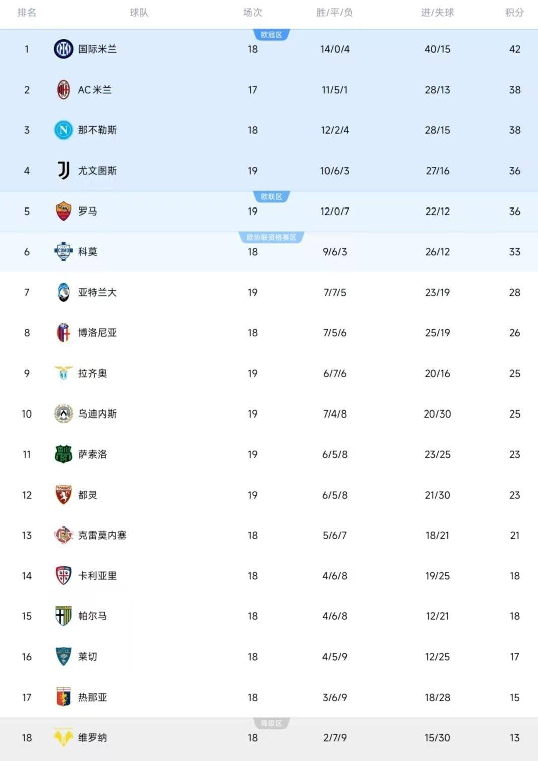 这一轮踢完,积分榜的轮廓更清晰了。 国际米兰39分(部分统计为42分),领跑优势微弱但坚实。 AC米兰38分,紧紧咬住。 而那不勒斯,虽然同样积38分(或37分),但那种遇弱不强的气质,让人对他们的冠军相打上一个问号。 别忘了,后面还有同积36分的尤文图斯和罗马虎视眈眈。 前五名球队挤成一团,最大分差不过一场球。
