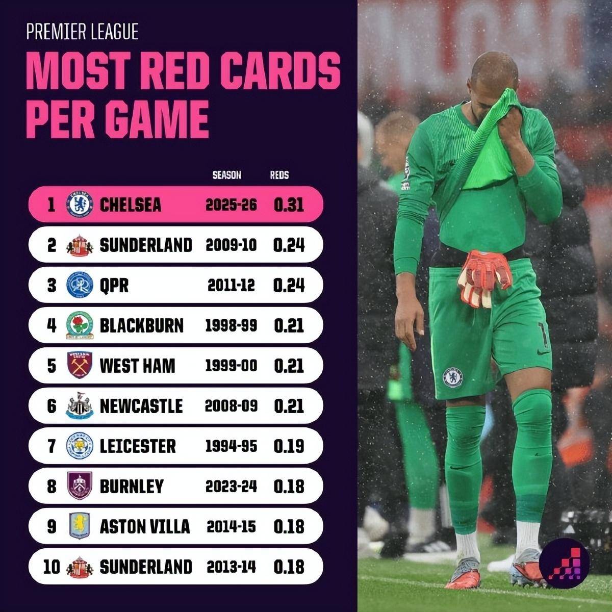 在成功夺得世俱杯冠军后,切尔西新赛季被广泛看好。然而,球队却意外陷入“红牌陷阱”。在英超前13轮比赛中,他们已累计吃到4张红牌,场均达到0.31张,若这一趋势持续,或将打破英超历史纪录。