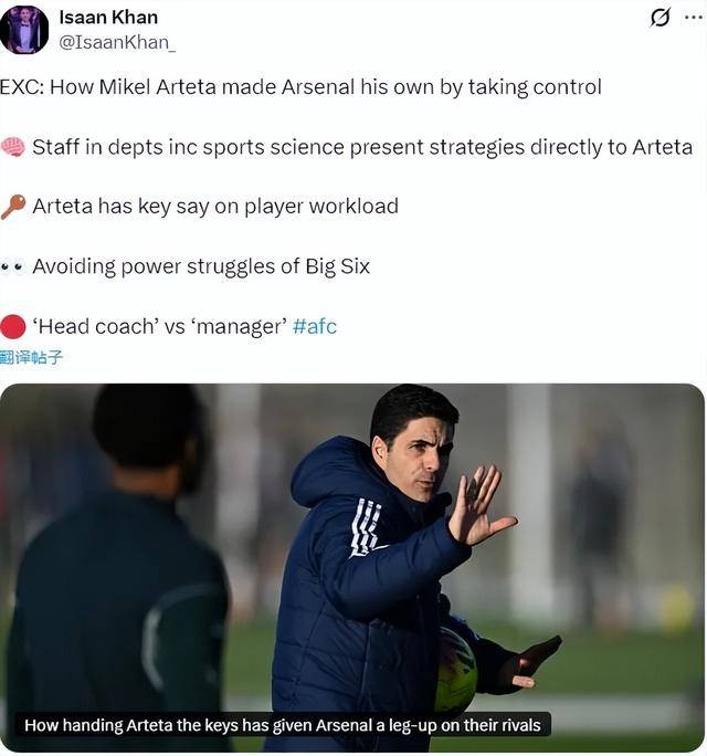 邮报记者IK发文表示,阿尔特塔是英超仅存的6名“足球经理”之一,而且是其中最年轻的(43岁),在很多关键领域,阿尔特塔的参与不仅很受欢迎,而且在意料之中,这种参与在英超目前日益行政主导的大环境下是很罕见的。