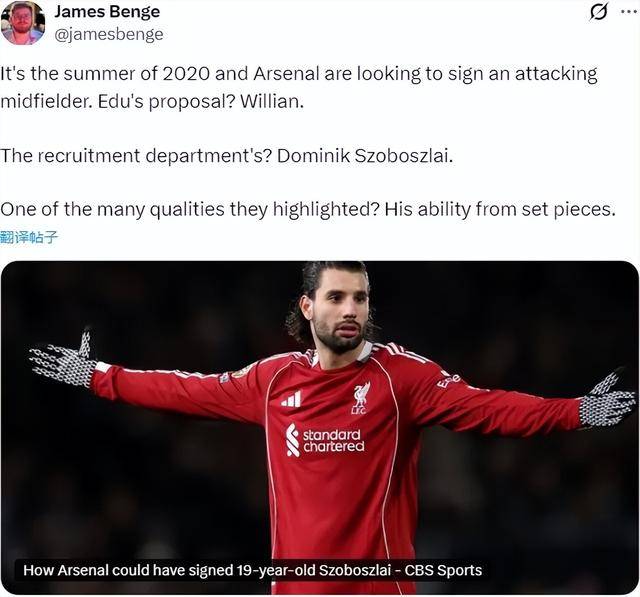CBS记者JB消息,在索博斯洛伊加盟利物浦之前的5年时间里,阿森纳一直在密切关注他,枪手的球探部门极力推荐这名中场,球员本人也对转会很感兴趣。