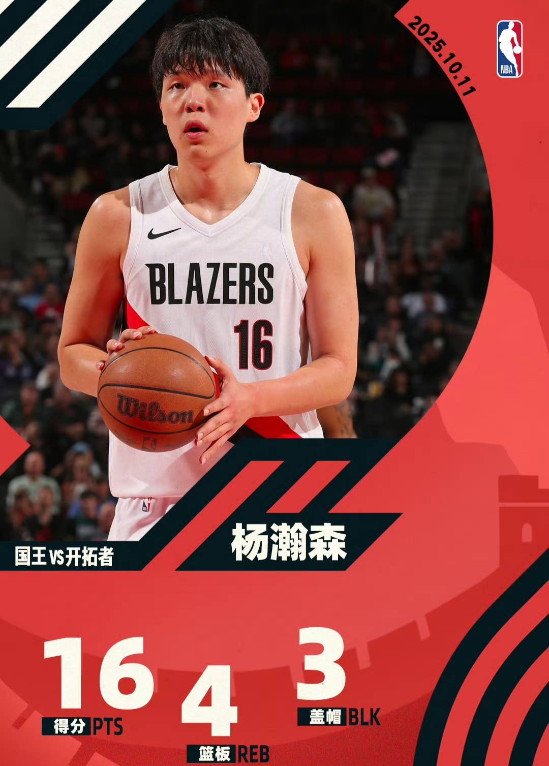 当时,队友克林根身陷犯规困境,五次犯规让他无法继续留在场上。就在这时,杨瀚森临危受命,毅然决然地扛起了球队进攻的大旗。他如同战神附体,单节比赛5投5中,全部命中,狂砍14分!这14分,有的是从右侧底角冷静的干拔三分,有的是在弧顶三分线外势大力沉的出手,还有的是一次充满智慧的转身抛投,以及一次疾风骤雨般的快攻跟进。他用多样化的进攻手段,撕裂了国王队的防线。不仅仅在进攻端闪耀,他还送出了一次关键助攻,为队友创造得分机会,更送出了一次精准的盖帽,捍卫了内线。正是他这一节的爆发,帮助开拓者队一度拉开了比分。在防守端,他同样表现出色,送出的3记“火锅”如同精准的制导导弹,一次次熄灭了国王队内线球员的进攻火焰。全场比赛,他的正负值高达 9,位列全队第二,成为了球队能够险胜对手的关键筹码。