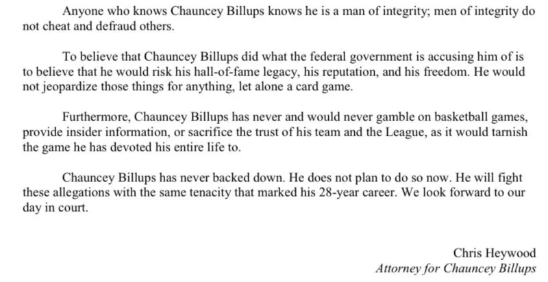 此外,昌西-比卢普斯从未也绝不会在篮球比赛上赌博、提供内部信息,或牺牲其球队与联盟的信任,因为这会玷污他奉献一生的体育事业。