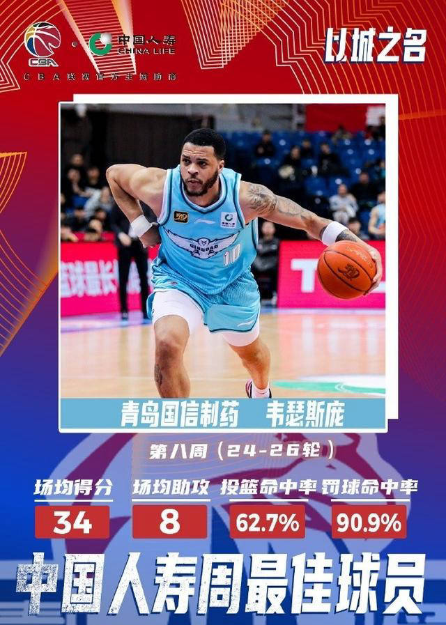 3. 青岛外援韦瑟斯庞也当选CBA常规赛第八周周最佳,本周3场比赛中场均得到34分、8次助攻和1.7次抢断,投篮命中率62.7%,罚球命中率90.9%,三分命中率50%。