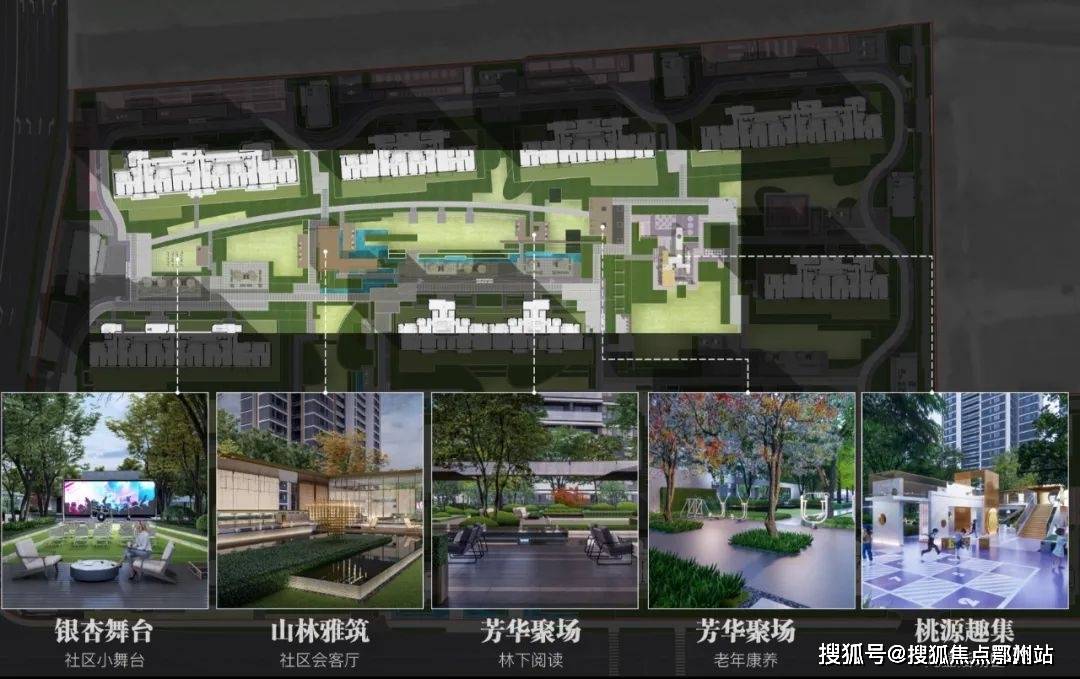 百吨极品黑山石与特选花木的极致交融,无一不呈现出项目的尊贵典雅。 二、五重形态,引水入园,打造标杆园林范式 项目各处细节采用蟒水纹凸显尊贵,择取中国传世名画北宋王希孟的《千里江山图》中的青绿之韵原色,点缀在公区的软硬装材质中,更彰显东方传承意韵之美。