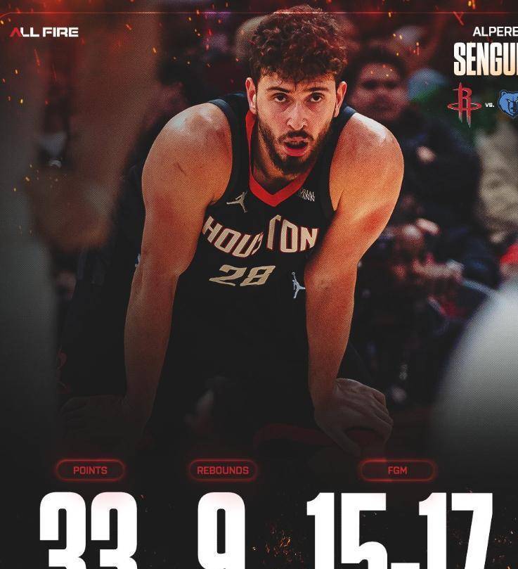 更扎心的是,ESPN专家直接点名:“东契奇的数据像艺术品,但申京的表现是核武器! ”原来火箭对灰熊的比赛中,申京全场17投15中,三分11中5,罚球4中3,砍下33分9篮板6助攻,命中率高达88%! 这不仅是火箭队史中锋单场30 最高效纪录(追平奥拉朱旺),更是NBA近20年唯一达成此数据的球员。