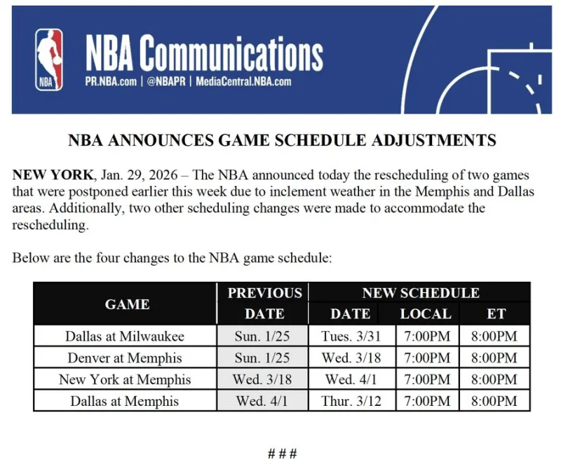NBA 今日宣布,本周早些时候因孟菲斯与达拉斯地区恶劣天气而推迟的两场赛事已确定重赛日期,同时为配合这两场重赛,联盟还对另外两场赛事的赛程进行了调整。