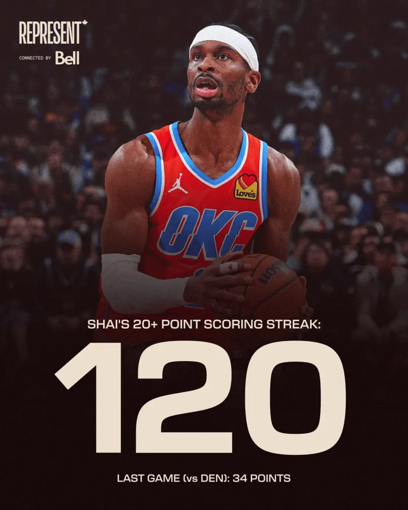 NBA官方晒照:亚历山大已经连续120场得到20+,他继续排在这项数据的历史第二,第一是威尔特-张伯伦的连续126场。
