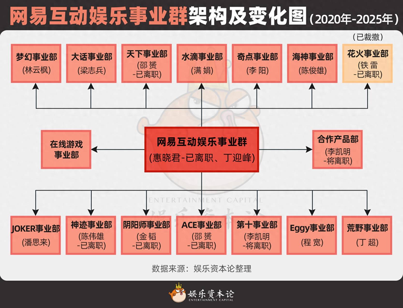 首先是2023年,网易互娱负责华东区域业务的联席总裁惠晓君(天佑)被退休,接着天下事业部总裁邵赟(少云)于2024春节后离职,且天下事业部被一拆三分为Eggy事业部、荒野事业部与天下事业部。