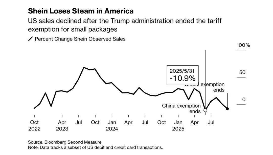 彭博社旗下调研机构Bloomberg Second Measure(BSM)数据显示,SHEIN 2025年9月销售额较2024年同期下降了8.2%。这是BSM对一组匿名美国消费者交易情况跟踪后得出的结论。而据BSM数据,这是过去3年来SHEIN销售额第二差的月度业绩——最差表现来自2025年5月,彼时同比降幅10.9%,同为关税调整期间。