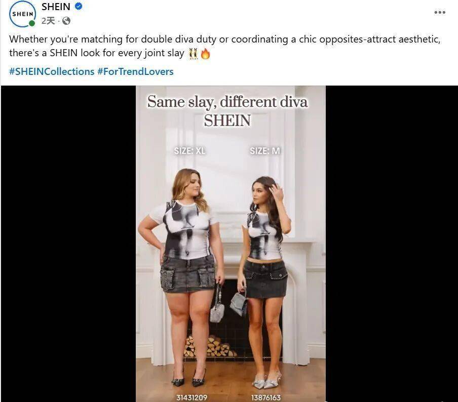 目前SHEIN的Instagram官方账号有粉丝超3933万,其Facebook官方账号有粉丝超3537万。在这两个账号上,SHEIN多年如一日发布网红买家秀、美容配饰开箱及多元穿搭分享。它的Facebook账号近期发布了一条和大码女装有关的内容,在展示尺码优势的同时,传递出了鲜明的价值主张。与其说SHEIN是个全品类电商,莫如说它更像是个围绕年轻女性构建的潮流商品社区。