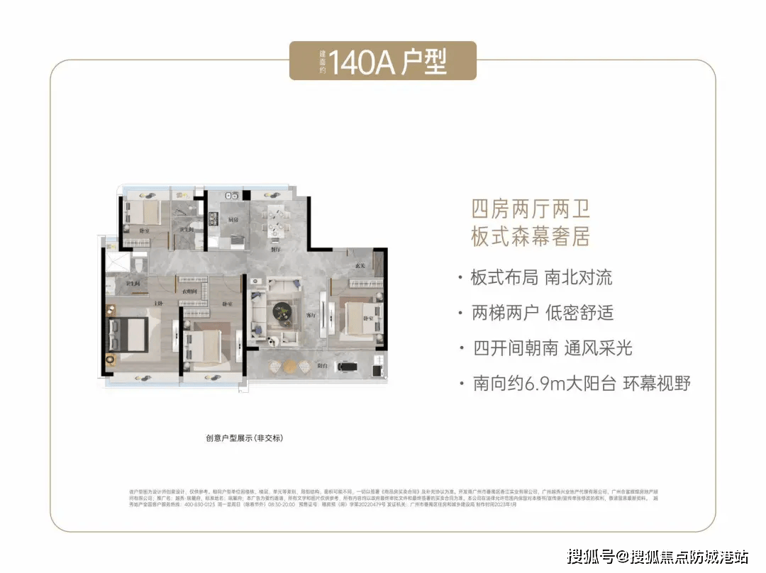140㎡四房:采用南向三开间布局,配备7.5米宽阳台和双套房系统,南北对流,通风采光极佳。精装交付标准对标酒店式居住体验,配备大金中央空调、新风系统、全屋净水系统等高端设施,厨房还装了独立空调,细节拉满。
