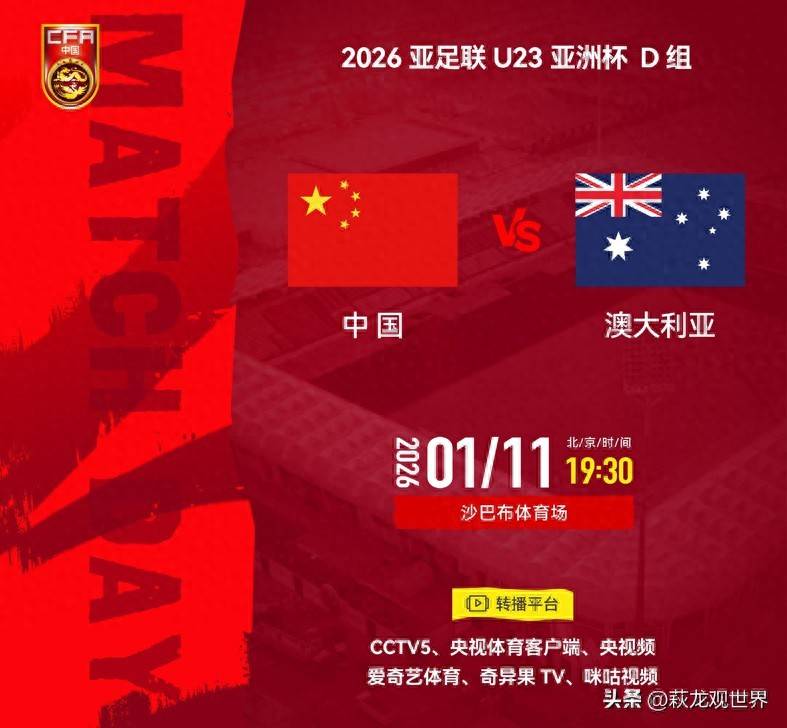 北京时间1月11日晚19:30,沙特沙巴布体育场将迎来2026沙特U23亚洲杯D组小组赛第二轮的焦点战——中国U23国足对阵澳大利亚U23。届时,CCTV5将现场直播这场关键战役,球迷朋友们也可通过央视体育客户端、央视频、爱奇艺体育、奇异果TV、咪咕视频等网络平台同步收看。