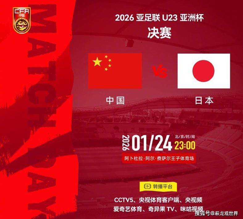 北京时间1月24日今晚23:00,2026沙特U23亚洲杯决赛,U23中国对阵日本U23。央视体育频道CCTV5继续进行现场直播!这是中国足球非常接近在亚洲重大赛事夺冠的一次机会,赛事之前,谁也没想到U23国足能杀进决赛,如今,冠军就在面前,中国队追逐梦想!将帅全力以赴。