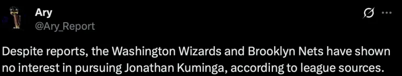 其写道:“虽然有相关报道,但是据联盟消息人士透露,奇才与篮网并未展现出对于追求乔纳森-库明加的兴趣。”