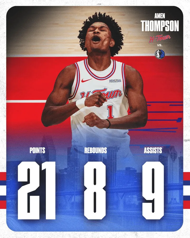 赛后,火箭官方晒出阿门-汤普森本场的数据海报并写道:“阿门在休斯顿力保城门,险些拿下三双!”